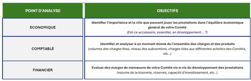 La détermination des coûts et des prix de vente des services que vous pouvez proposer à vos partenaires locaux passe par une analyse préalable de la situation économique, comptable et financière de votre Comité. Sans cet exercice, il est difficile de déterminer un coût et un prix de vente qui soit en adéquation avec votre situation.
