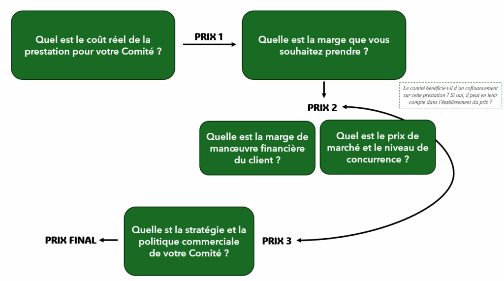 Une fois déterminé le coût réel estimé de la prestation pour votre Comité, la proposition d’un prix de vente se fonde sur plusieurs aspects. En savoir plus ici.