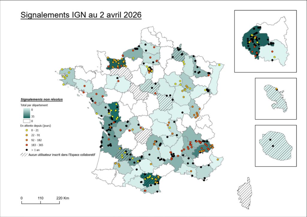 L’Espace collaboratif de l’IGN permet à l’Institut de remonter vers la Fédération des problèmes constatés sur le terrain (divergences par rapport aux données de la base fédérale, problèmes de balisage, etc..). Les Comités sont invités à mettre en cohérence les observations de terrain de l’IGN avec la base fédérale (mise à jour du WebSIG et/ou du terrain). Il est également possible aux Comités de remonter par ce canal des anomalies constatées sur les cartes IGN. Ce partenariat de longue date permet d’assurer une cohérence réciproque des données de l’IGN et de la Fédération. Pour mémoire, l’IGN reproduit sur les fonds SCAN 25 (Série bleue et TOP 25) les tracés des itinéraires GR®, GR® de Pays, PR Labellisés que la Fédération lui livre deux fois par an. Les réponses aux signalements IGN constituent une manière complémentaire de remonter des mises à jour.